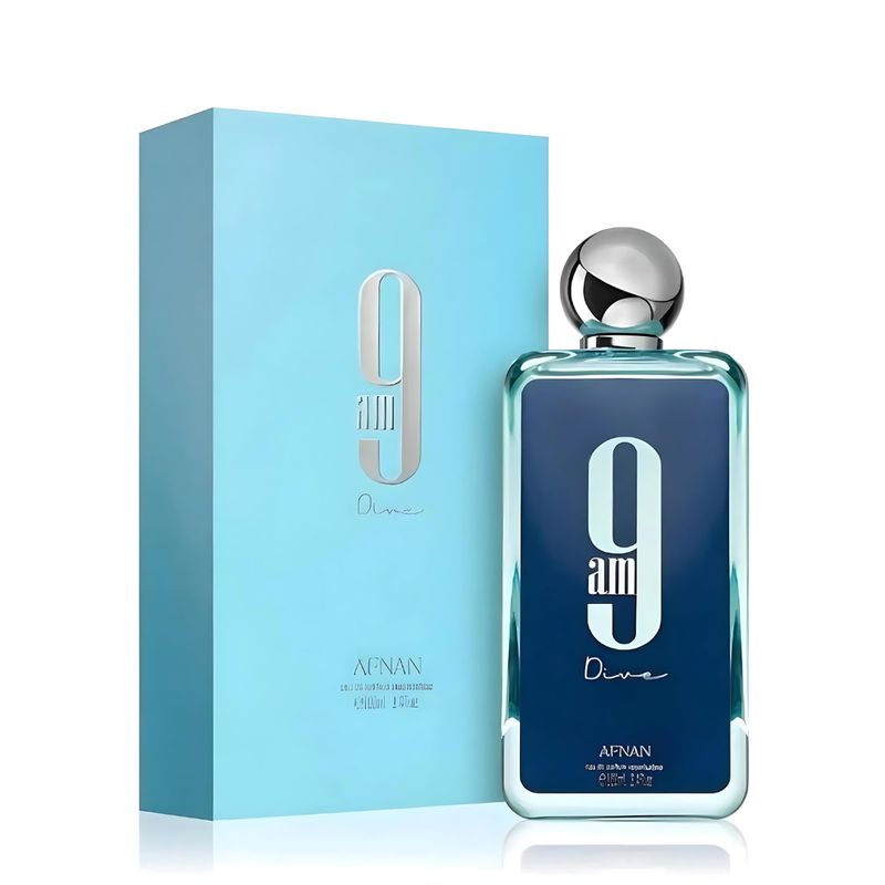 Afnan 9 AM Dive es un perfume con una fragancia aromática acuática, que combina notas cítricas, especiadas y frescas. Se describe como una fragancia vibrante y refrescante, ideal para el uso diario, especialmente en climas cálidos