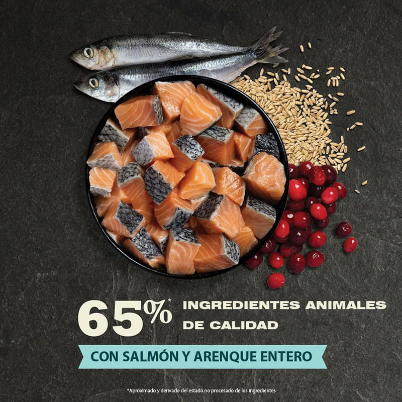 Elaborado con salmón crudo y arenque entero como principales fuentes de proteína animal.