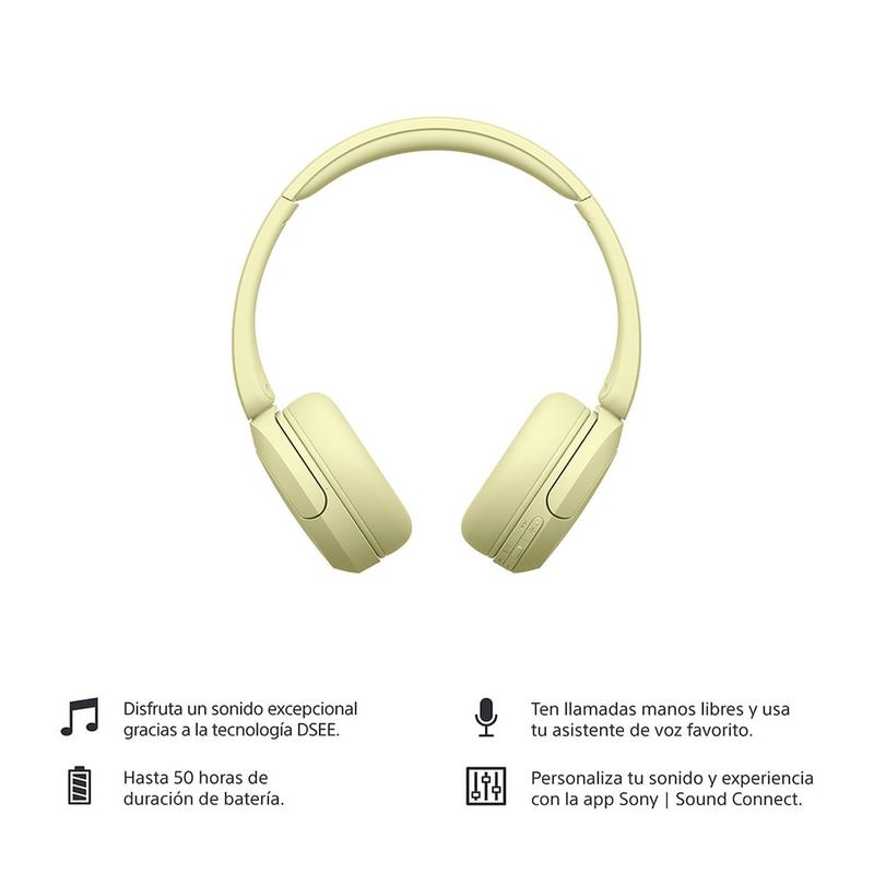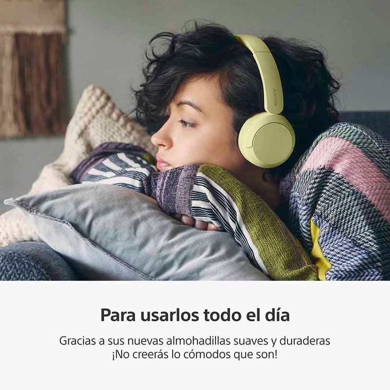 Los audífonos inalámbricos WH-CH520, diseñados con la comodidad para llevarlos puestos todo el día sin renunciar a un buen sonido, aportan estilo, versatilidad y facilidad de uso. Están disponibles en cuatro colores diferentes que se adaptan perfectamente a tu estilo y te ofrecen un sonido claro y confiable, tanto si escuchas música como si llamas por teléfono.