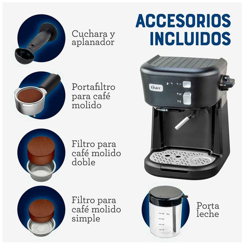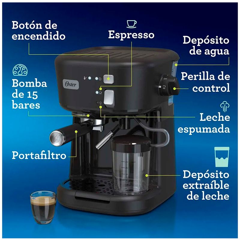 El placer de un café delicioso es una sensación que deberías poder disfrutar a cualquier hora. La cafetera de espresso Oster® ofrece una forma fácil de personalizar tus bebidas favoritas de espresso. La bomba de 15 bares y el sistema espumador de leche son ideales para crear deliciosos espressos, cappuccinos, lattes y más desde la comodidad de tu hogar. Incluye portafiltro con filtros para shot sencillo y doble.