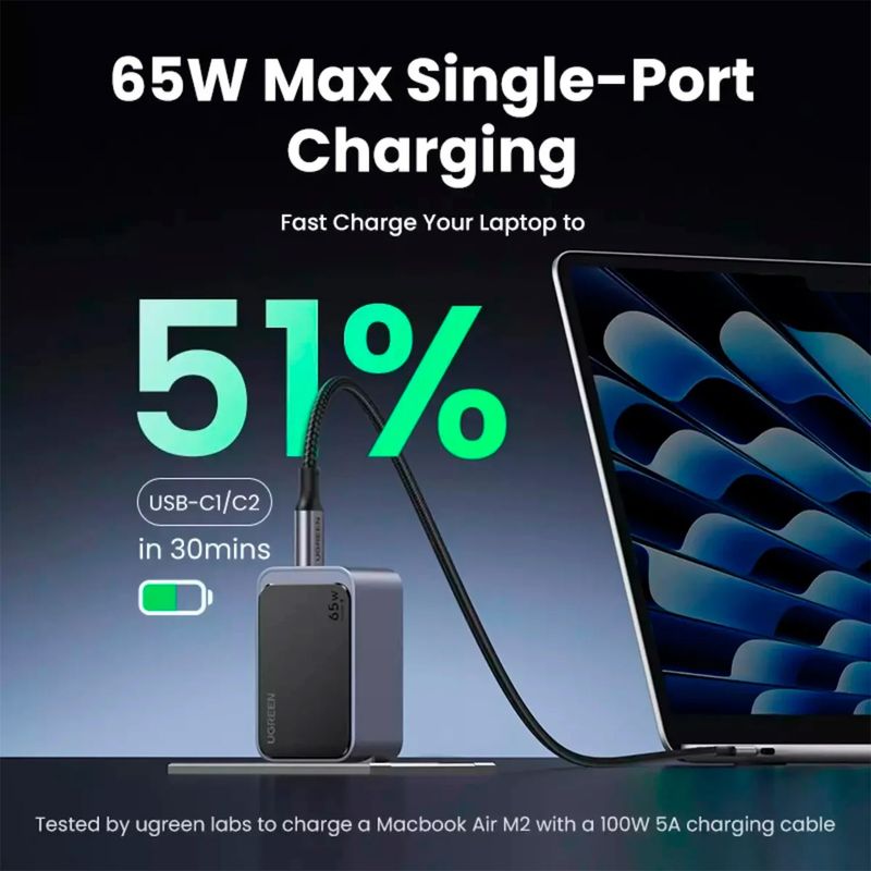 Con 65 W de salida total y distribución inteligente de energía, puede cargar una laptop, un teléfono y unos auriculares al mismo tiempo sin pérdida de rendimiento.