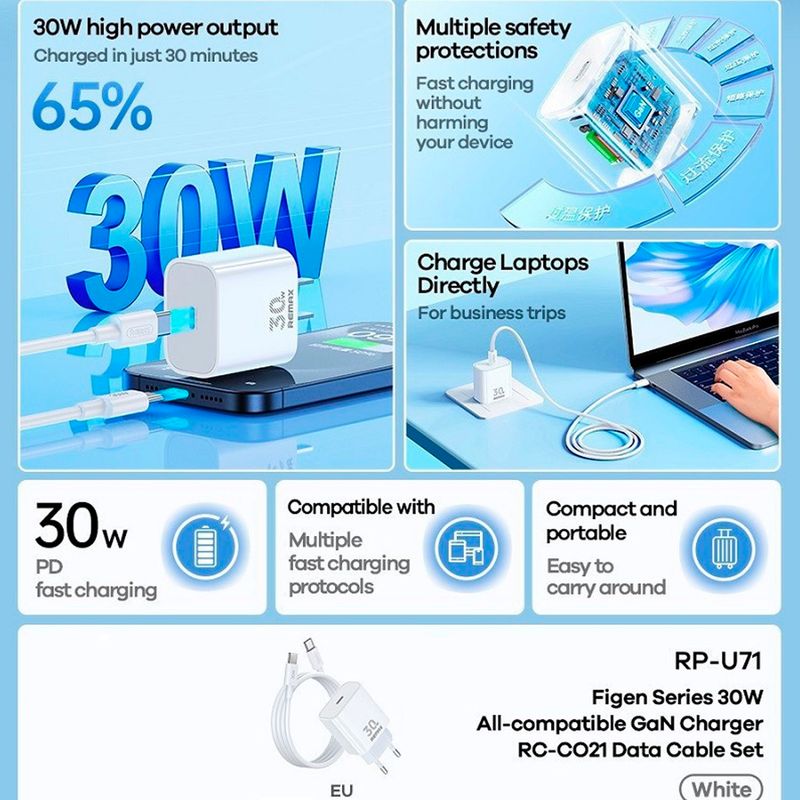 El cargador de pared REMAX RP-U71 es tu solución para una carga ultrarrápida. Con una potencia de 30W y tecnología de carga inteligente, este cargador es compatible con una amplia gama de dispositivos, desde smartphones hasta tablets. Su diseño compacto y ligero lo hace perfecto para llevarlo a todas partes y asegurarte de que tus dispositivos siempre estén listos.