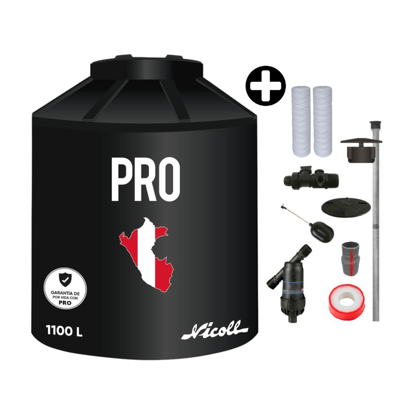 Construccion y herramientasGasfiteriaTanques de Agua y AccesoriosCOMBO Tanque de agua Pro 1100 litros Negro + Kit de Accesorios + 2 Cartuchos Repuesto Filtro De Sedimentos 5u Agua Vida
