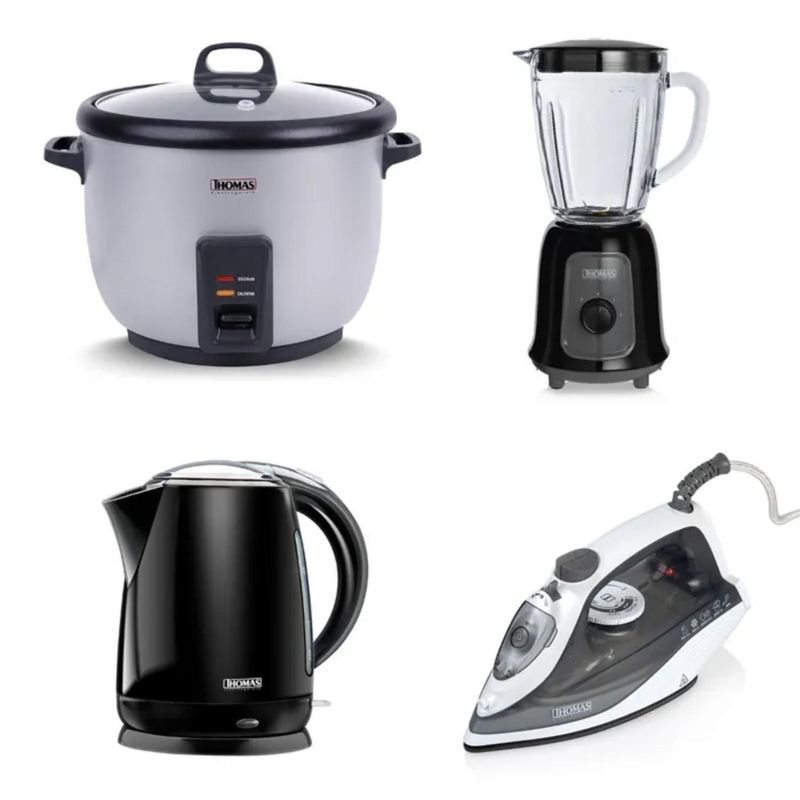 El combo Thomas incluye una licuadora TH-330V de 600 watts, olla arrocera TH-36P de 900 watts, hervidor TH-4330 de 2200 watts y plancha TH-7003 de 1600 watts. La licuadora de 1.5 litros y 2 velocidades (+ pulso) tiene vaso de vidrio, 4 cuchillas removibles de acero inoxidable recubiertas en titanio Fold Titanium Blades, switch de seguridad y vaso dosificador. La olla arrocera de 2.2 litros posee función automática para mantenimiento de temperatura, tapa de vidrio templado con difusor de vapor, recipiente interior antiadherente removible, botón de un solo toque para fácil manejo, luz indicadora de funcionamiento y recipiente de cocina a vapor. El hervidor de 1.8 litros cuenta con base interior de acero inoxidable, cuerpo de plástico con detalle de acero inoxidable, base desmontable con giro de 360°, luz indicadora de funcionamiento, doble indicador de llenado,filtro para las impurezas del agua, sistema de seguridad de funcionamiento en seco y apagado automático. Finalmente, la plancha viene con rociador de agua, sistema antisarro, vapor vertical, regulador de vapor, sistema de auto limpieza, base de antiadherente y luz indicadora de funcionamiento.