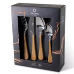 Transforma tu mesa con estilo gracias al Set de Cubiertos 24 pzas Krons Wood en acero inoxidable. Sus mangos con acabado tipo madera le otorgan un toque distintivo y elegante.