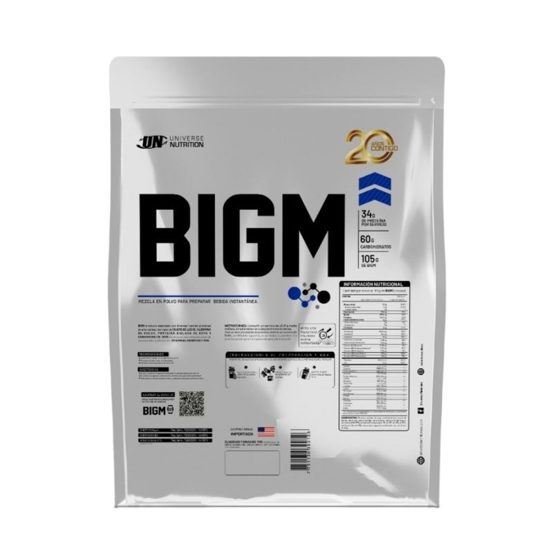BIGM producto elaborado con diversas fuentes proteicas de alta calidad, derivado del SUERO DE LECHE, ALBÚMINA DE HUEVO, PROTEÍNA AISLADA DE SOYA Y CARBOHIDRATOS. BIGM cuenta con una concentración de aminoácidos de cadena ramificada “BCAA” y además de CREATINA Y L-GLUTAMINA.