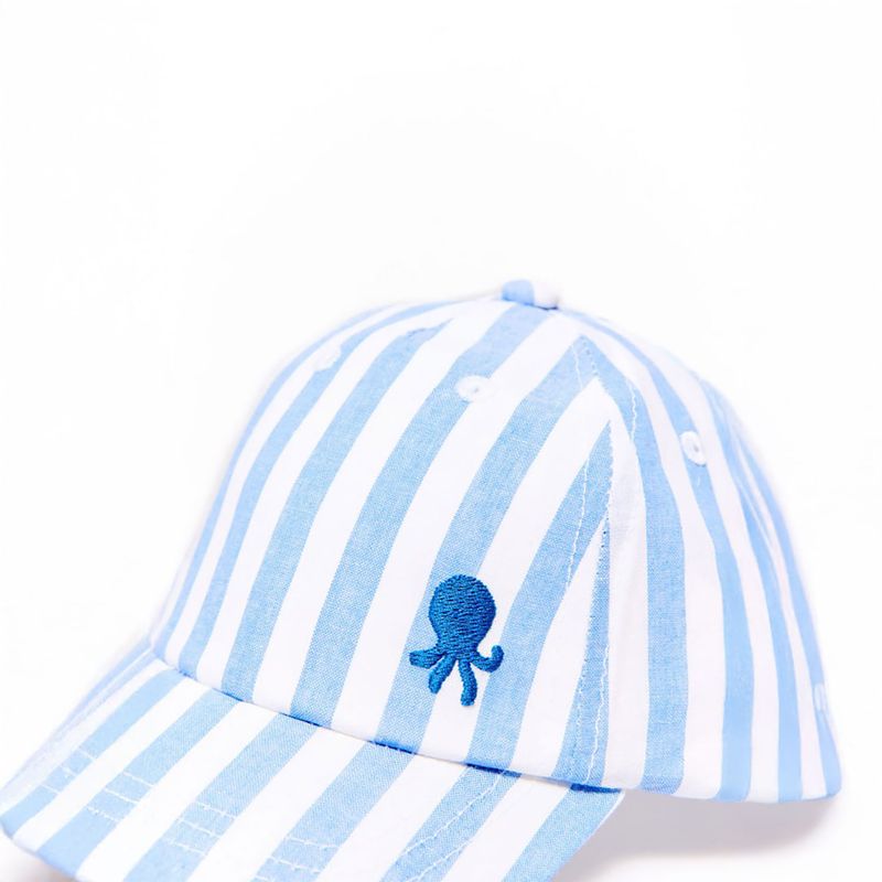 Gorra estampada de rayas con detalle de bordado y cierre ajustable. Algodón 100%