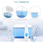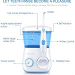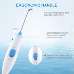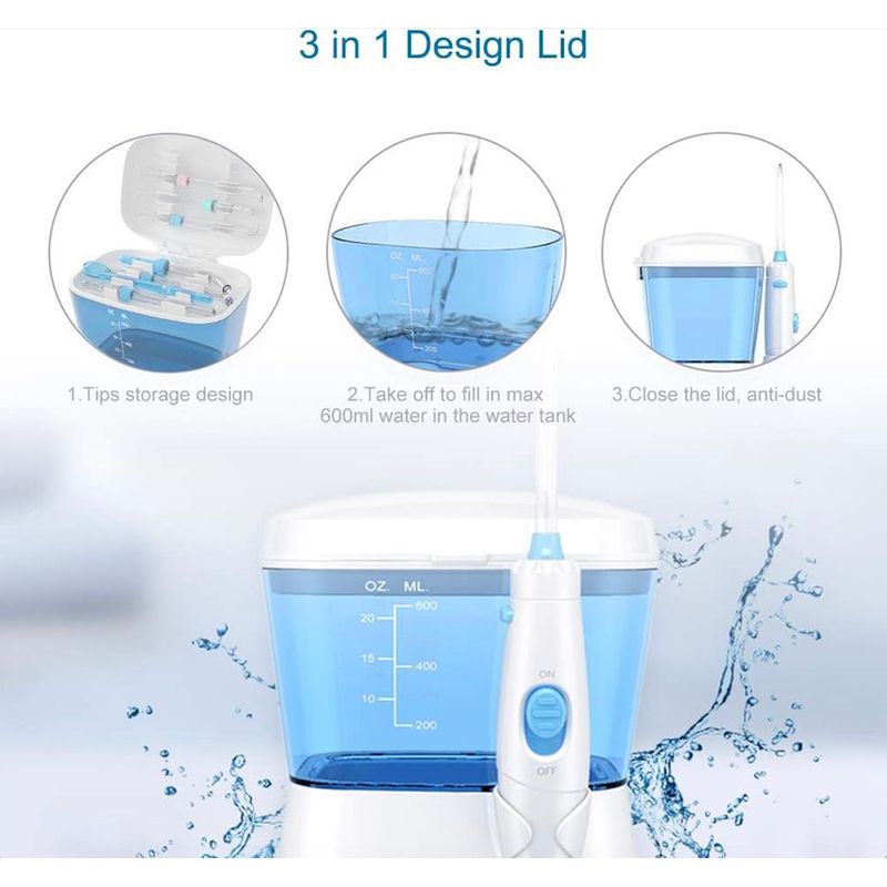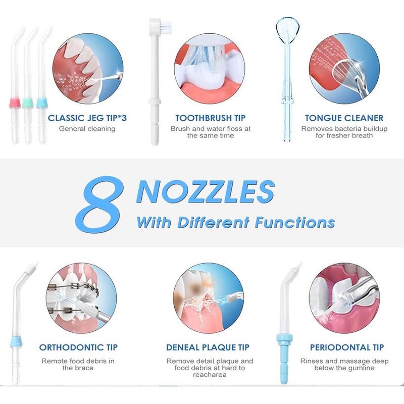 Viene con 8 boquillas para toda la familia: el limpiador dental de agua viene con 3 puntas ordinarias de alta presión, 5 otras puntas de chorro de agua de uso especial (1 punta de cepillo de dientes, 1 punta periodontal, 1 punta de manchas, 1 punta de ortodoncia, 1 punta de limpiador de lengua). También puede limpiar profundamente los restos de alimentos con diferentes consejos. Los chorros de agua dentales reemplazables se pueden almacenar higiénica y convenientemente en la cubierta de ranuras separadas en la parte superior del irrigador de agua.