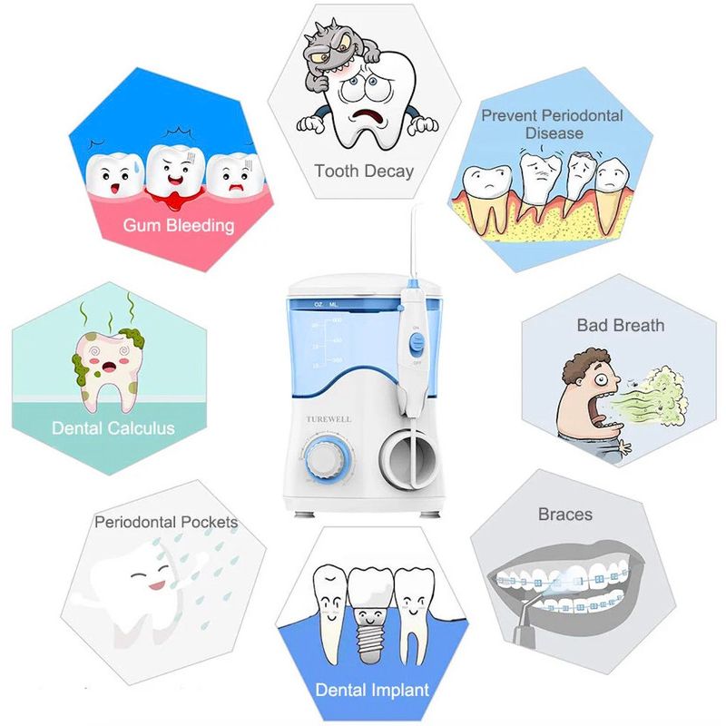 Limpia los dientes más profundamente, blanquea los dientes potente y mejora la salud de las encías: en comparación con el cepillo de dientes normal, limpiador de dientes o hilo dental que no puede alcanzar las partes ocultas, pero el irrgador oral de agua TUREWELL hasta 1700 veces/min, la pulsación de agua de hasta 30-125 psi puede alcanzar profundamente las partes ocultas, eliminan los restos de comida y masajean las encías de manera eficiente, evitan manchas de dientes, mal aliento y otros orales. problemas. Es un buen limpiador de dientes para personas con aparatos ortopédicos, implantes, coronas o bolsillos periodontales.