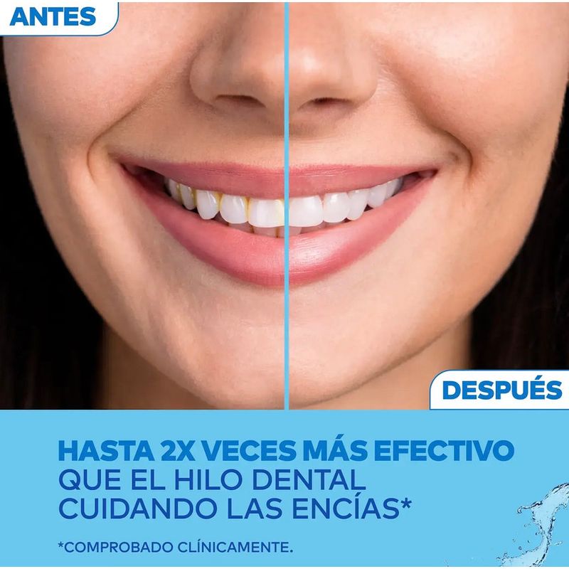 Elimina hasta el 99,9 % de la placa bacteriana que causa gingivitis, caries y mal aliento de las áreas tratadas y está clínicamente probado que es hasta 2 veces más eficaz que el hilo dental para eliminar la placa bacteriana y mejorar la salud de las encías.
