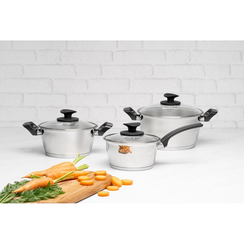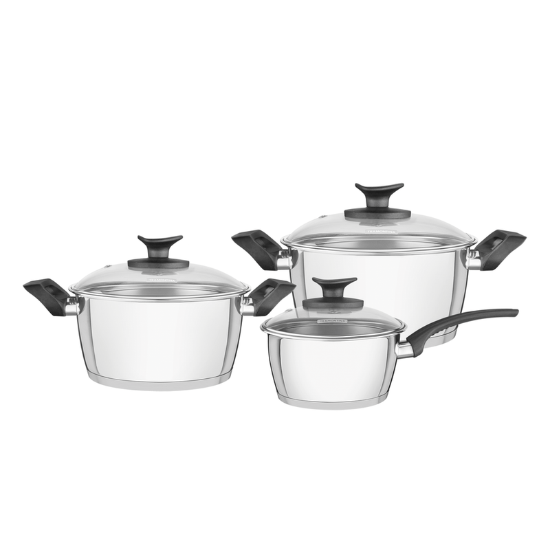 Los amantes de la culinaria lo confirman, además de alimentos sabrosos, una deliciosa comida necesita prepararse en utensilios de calidad. La batería de cocina Tramontina de acero inoxidable fondo triple con mangos y asas de baquelita 3 piezas conjuga practicidad y seguridad en toda su línea. Totalmente hechas de acero inoxidable, las ollas no sueltan residuos en los alimentos, manteniéndolos sanos. El fondo triple (acero inoxidable + aluminio + acero inoxidable) distribuye el calor uniformemente, lo que proporciona una cocción más rápida. Altamente durables, las ollas mantienen las características originales, preservando la belleza, la higiene y la durabilidad del material. Los mangos y asas poseen protector de llamas y no se calientan, evitando que se quemen cuando la llama no esté centralizada en el fondo de la olla. Las tapas, con encaje perfecto, tienen salida de vapor para que la preparación de su receta sea totalmente segura. La batería se puede utilizar en las cocinas: de gas, eléctrica, vitrocerámica y por inducción y para limpiar, basta colocar las ollas en el lavavajillas. La batería de cocina Tramontina de acero inoxidable fondo triple con mangos y asas baquelita con terminación brillante es perfecta para quien le gusta la sofisticación y la practicidad en la cocina.