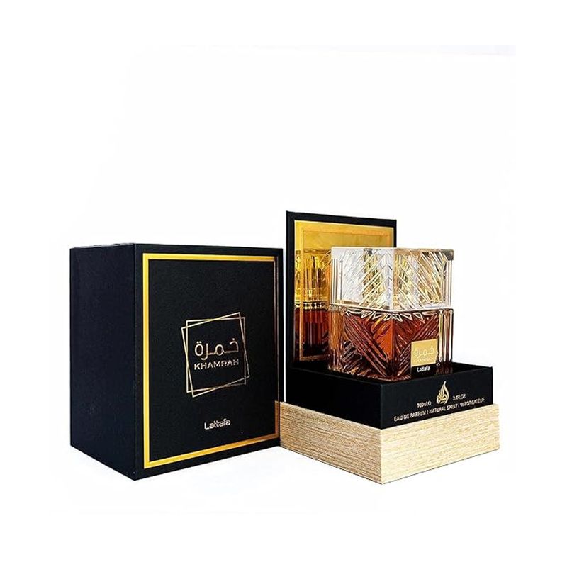 El perfume Khamrah de Lattafa huele a una mezcla especiada y dulce, con notas predominantes de canela, vainilla, dátiles y madera de ámbar. También