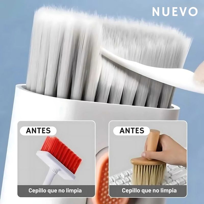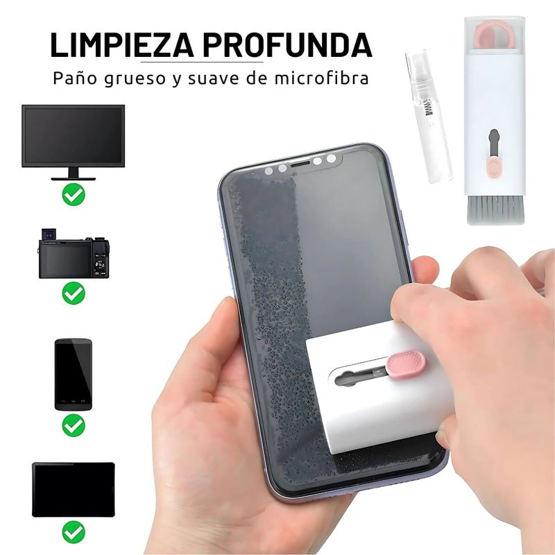 - El kit consta de: Cepillo regular, limpiador de pantalla spray, removedor de teclas, herramienta 3 en 1, y fibra para limpiar impurezas luego de aplicar el spray.
