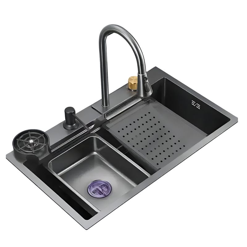 Características: Este modelo cuenta con dos secciones de fregadero con drenaje, un grifo moderno y un diseño único para mayor funcionalidad.