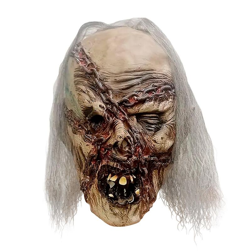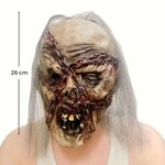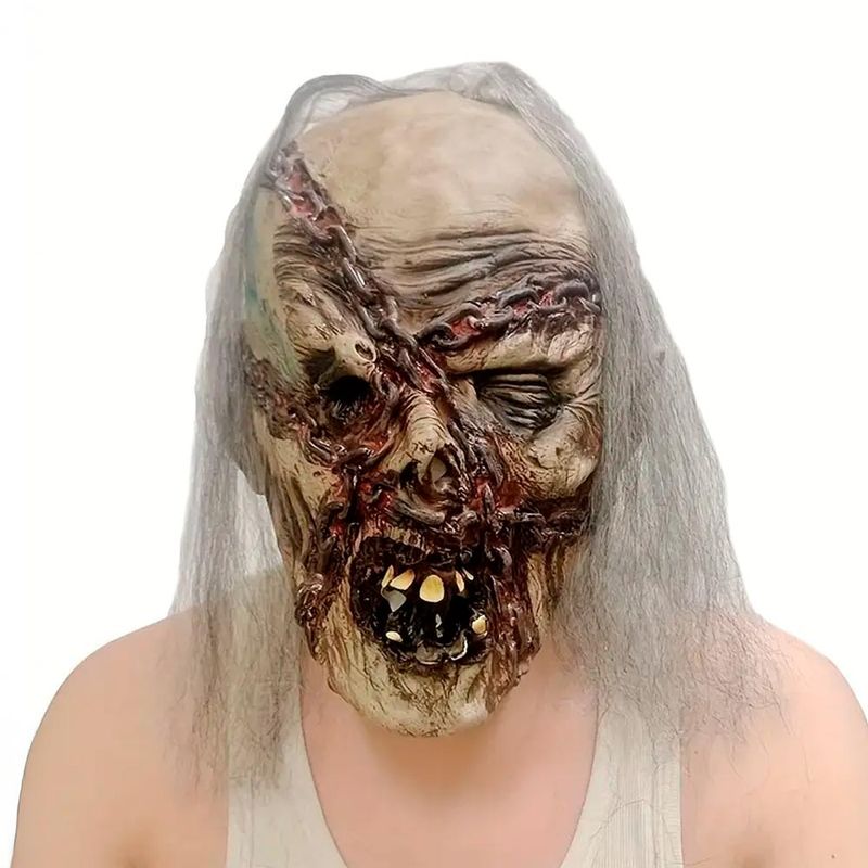 Haz temblar a todos con esta máscara de látex de zombie, con heridas profundas, cicatrices cosidas y dientes putrefactos. Un accesorio impactante para Halloween o cualquier evento de terror. Convierte tu disfraz en el más aterrador de la noche.