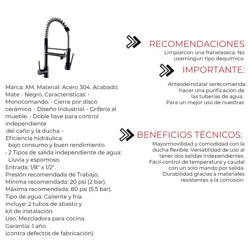 Dale a tu cocina un estilo moderno, elegante y funcional con la grifería premium XM, fabricada en acero inoxidable 304 de alta durabilidad y acabado mate negro. Su diseño industrial combina potencia, estética y practicidad, ideal para cocinas exigentes y con alto flujo de uso.
