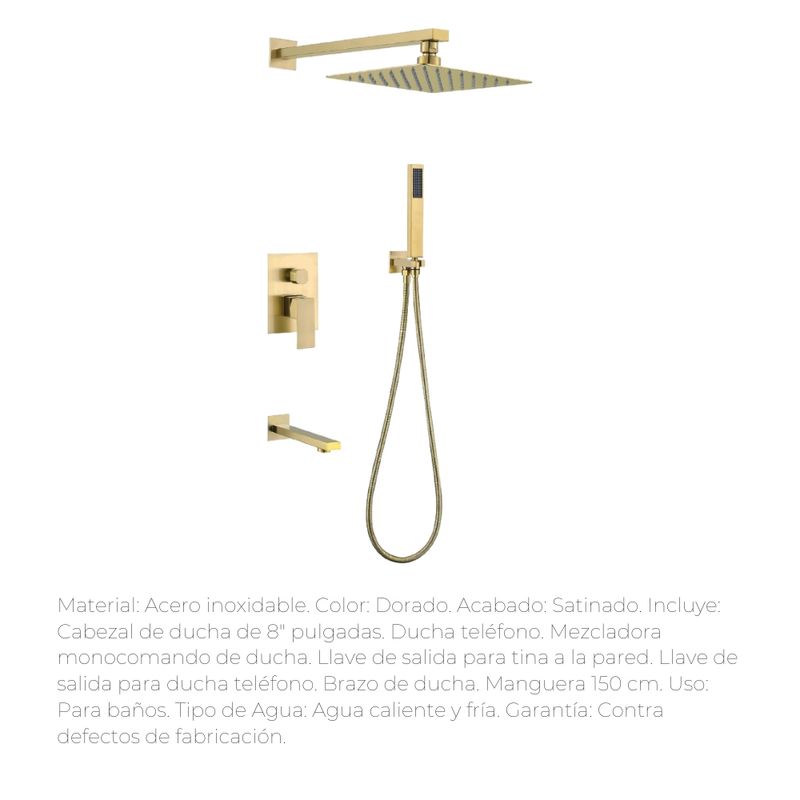 Renueva tu baño con este elegante juego de ducha empotrada, elaborado en acero inoxidable con acabado dorado satinado, que aporta estilo moderno y resistencia a la corrosión. Ideal para quienes buscan lujo, practicidad y durabilidad en un solo producto.