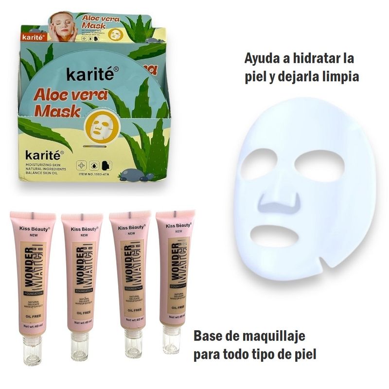 Contamos con este set que incluye una mascarilla facil de aloe vera y uan base de maquillaje para el rostro, las base es de un tono natural, tapa todas las impurezas y la mascarilla se usa después de una limpieza completa de rostro para hidratar y purificar completando tu cesión de skinker.