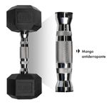 Diseño hexagonal de goma caucho, es una gran opción que cumple con la calidad, el rendimiento y la longevidad. Cabezas de goma-revestido para minimizar el ruido y el límite de desgaste, mientras que el mango cromado está diseñado ergonómicamente para que sea cómodo en cualquier estilo de agarre. Especificación de kg grabada. Peso: 17.5 kg (Total vienen 2 unidades de 17.5 kg, ambas suman 35 kg)