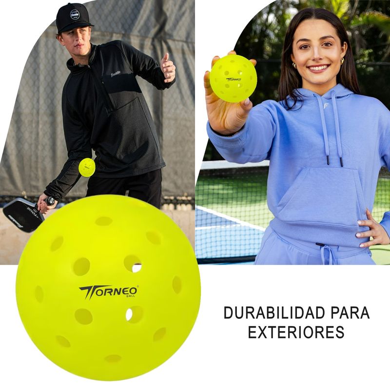 Exterior Pickleball Bolas son robustos e resistentes a la intemperie. Ofrecen una trayectoria uniforme y son ideales para juegos al aire libre. Estas bolas son algo más pesadas y tienen agujeros más pequeños para minimizar la resistencia al viento.