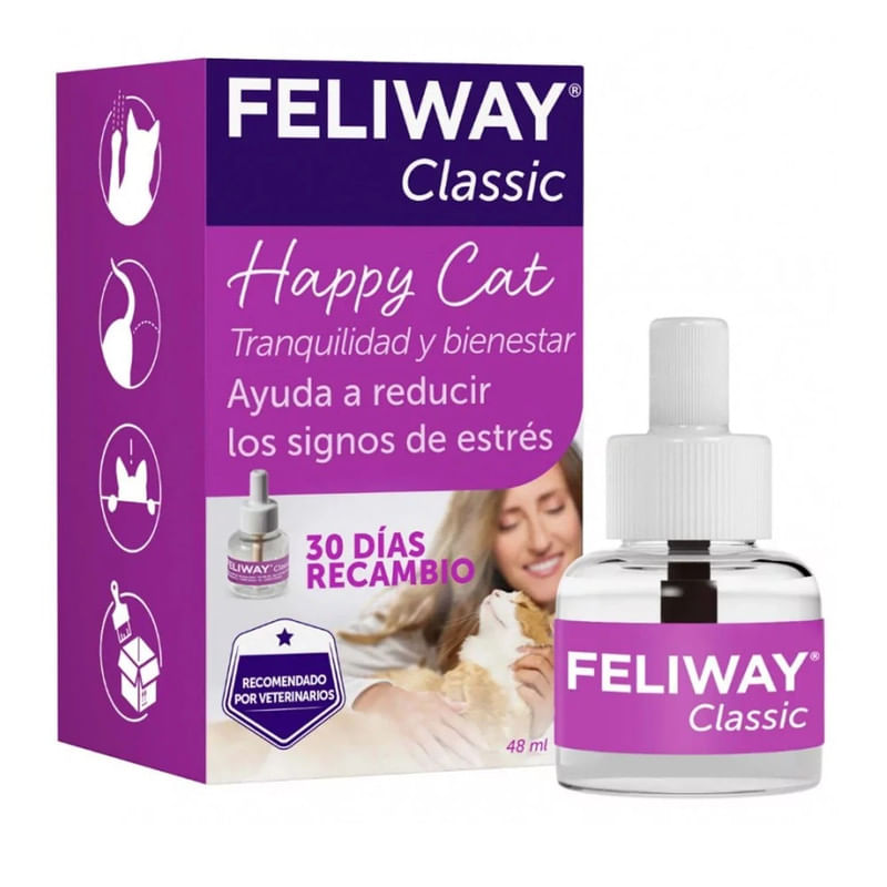 El Feliway Classic Recarga es un producto esencial para mantener un entorno agradable y seguro para tu gato. Diseñado para ser utilizado con el difusor Feliway Classic, este recambio libera una copia sintética de la feromona facial felina F3, ayudando a reducir el estrés y estabilizar el comportamiento de tu gato en situaciones desafiantes.