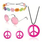 - 1 collar fucsia símbolo de la paz, hecho de plástico. Medidas: 5cm de diámetro del dije y 20cms de largo + 5cms ajustables.