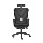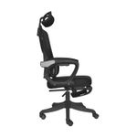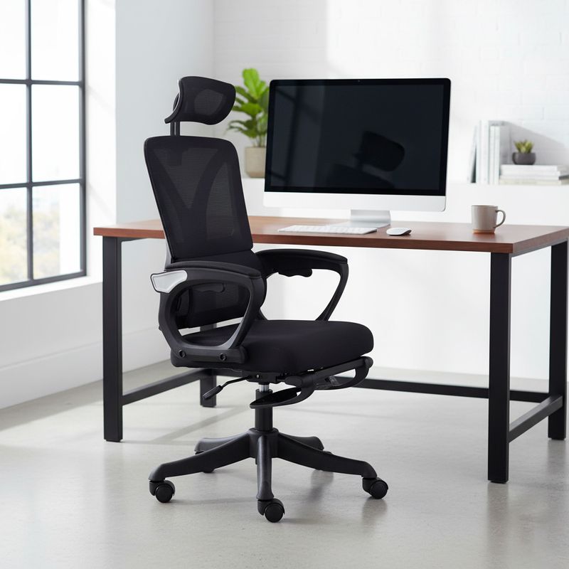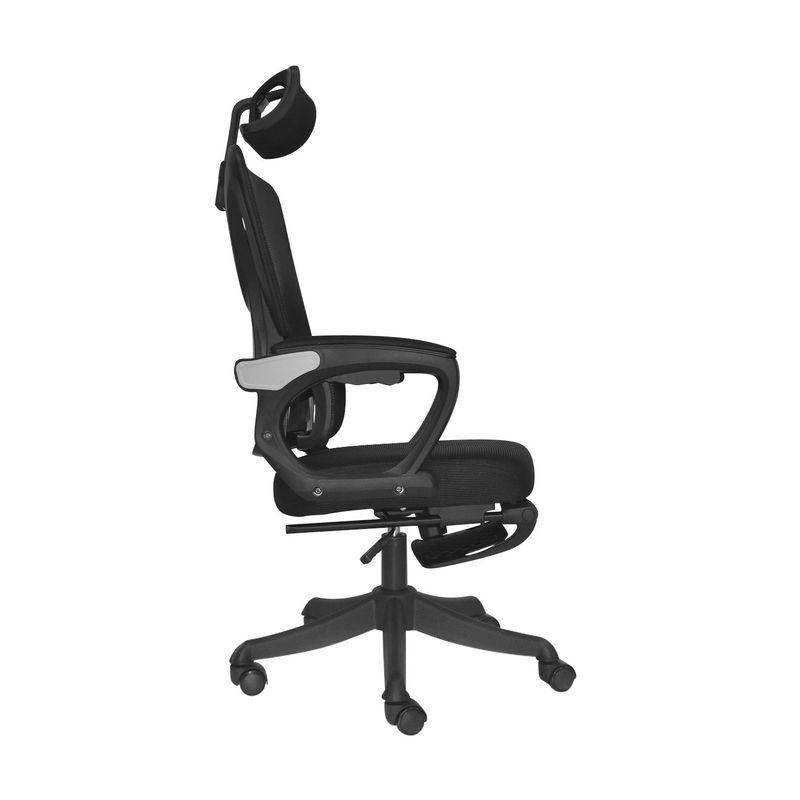 En marco blanco y tela negra, regulable en altura y ángulo.