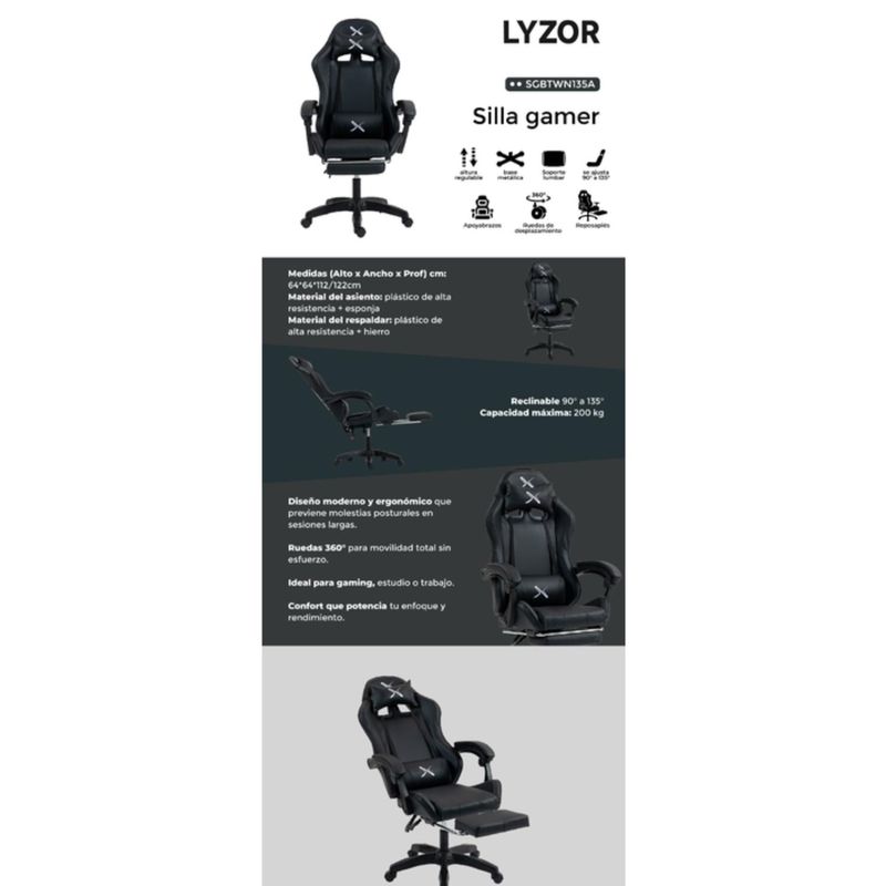 Pasa tus horas frente al computador de forma cómoda con la silla gamer Lyzor SGBTWN135A Negra con reposapiés. Tiene un diseño moderno, 100% ergonómico, con finos detalles y acabados de la más alta calidad; perfecto para jugadores, streamers y profesionales durante su jornada laboral, clases virtuales, partidas y más. Además, la silla gamer negra con posapiés cuenta con una estructura resistente, siendo capaz de soportar hasta 200 kilos.