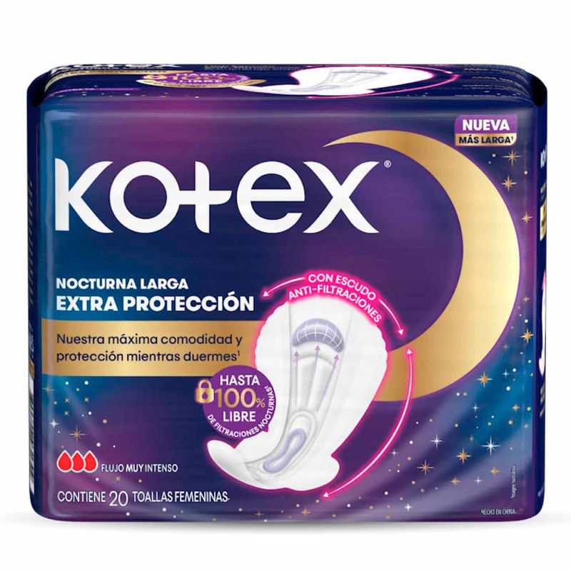 Salud y bienestarProtección FemeninaToallas Higiénicas y TamponesToalla Higiénica KOTEX Nocturna Larga Bolsa 20un
