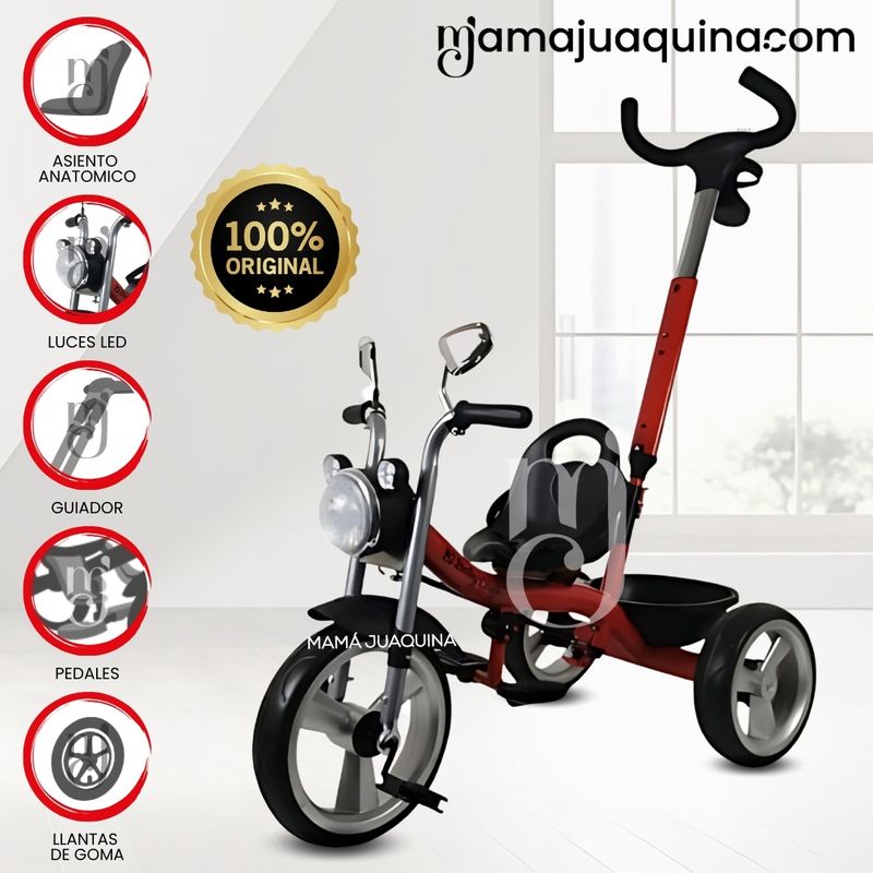• Diseño tipo moto con acabados metálicos: un estilo moderno que encanta a los niños.