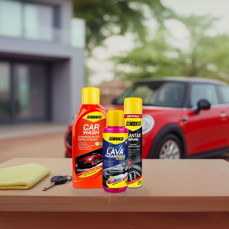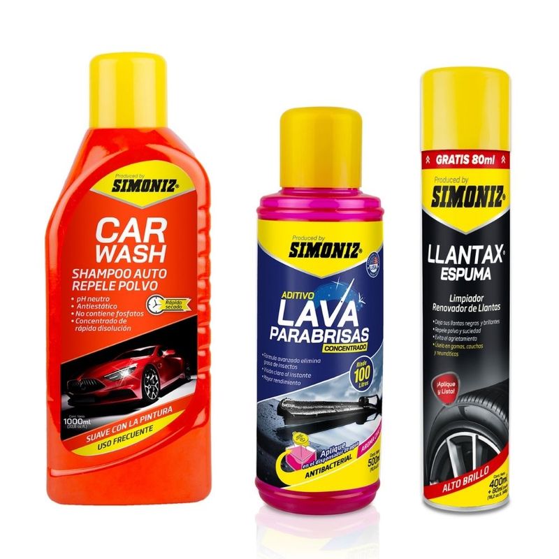 Tripack Limpieza Exteriores Simoniz: Shampoo para auto 1000ml + Aditivo Lava Parabrisas 500ml + Limpiador Removedor de Llantas 480ml
