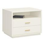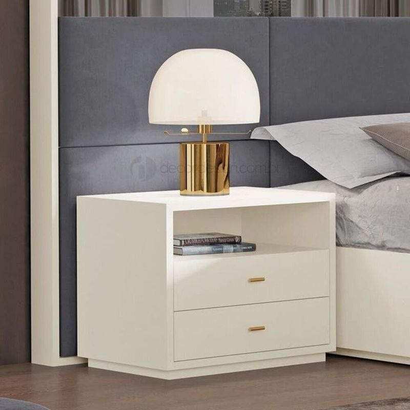 Este velador moderno combina líneas limpias y un diseño funcional que se adapta perfectamente a cualquier dormitorio elegante y contemporáneo. Su estructura en melamina color blanco aporta amplitud y luminosidad al espacio, mientras que sus tiradores metálicos en tono dorado añaden un toque de sofisticación. Cuenta con dos amplios cajones para mantener tus objetos personales organizados y una repisa superior abierta, ideal para colocar libros, relojes o decoraciones. Su superficie plana permite ubicar lámparas, portarretratos o elementos decorativos, convirtiéndolo en una pieza práctica y decorativa a la vez. Medidas: Alto: 50 cm Largo: 55 cm Fondo: 40 cm Color y material: Melamina Blanca Información adicional: Producto fabricado a pedido. El producto se entrega armado. No incluye servicio de instalación. Las imágenes son referenciales; el color puede variar según la iluminación o el dispositivo. Revisa nuestros términos y condiciones para más información.