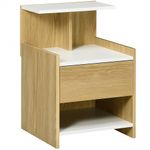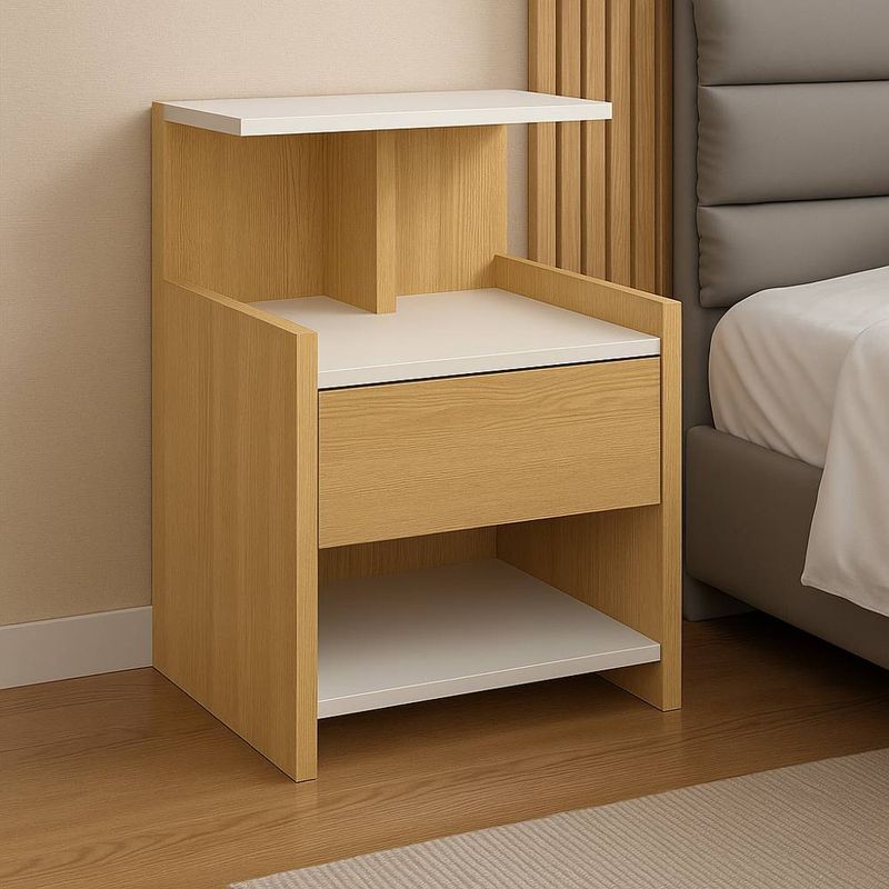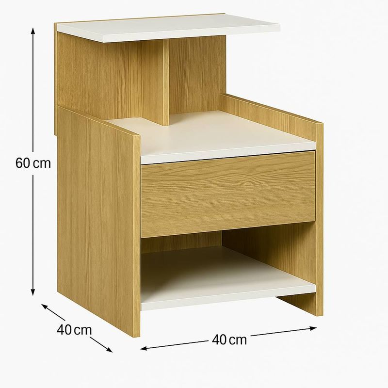 Su estructura incluye un cajón amplio, ideal para guardar objetos personales, y dos superficies abiertas que ofrecen espacio adicional para colocar libros, lámparas o elementos decorativos. Su diseño vertical aprovecha al máximo el espacio sin sacrificar estilo.