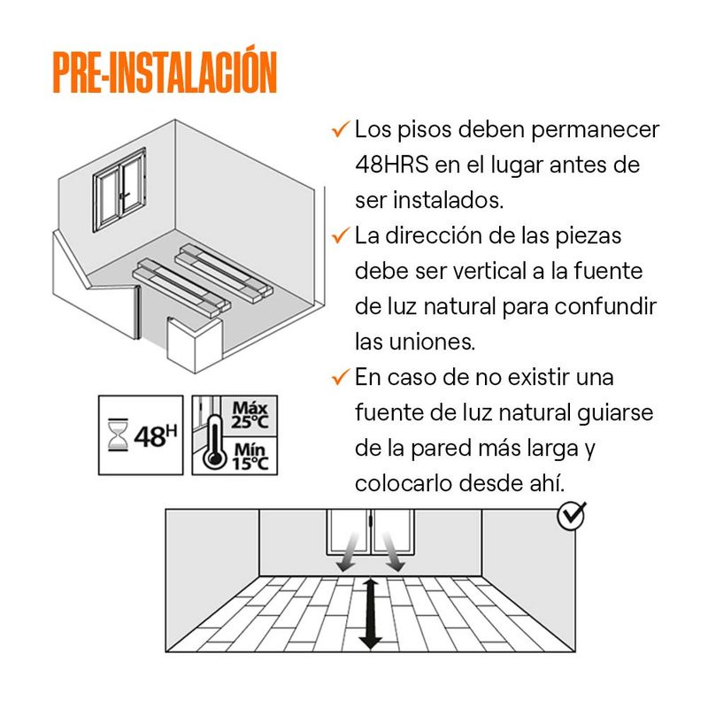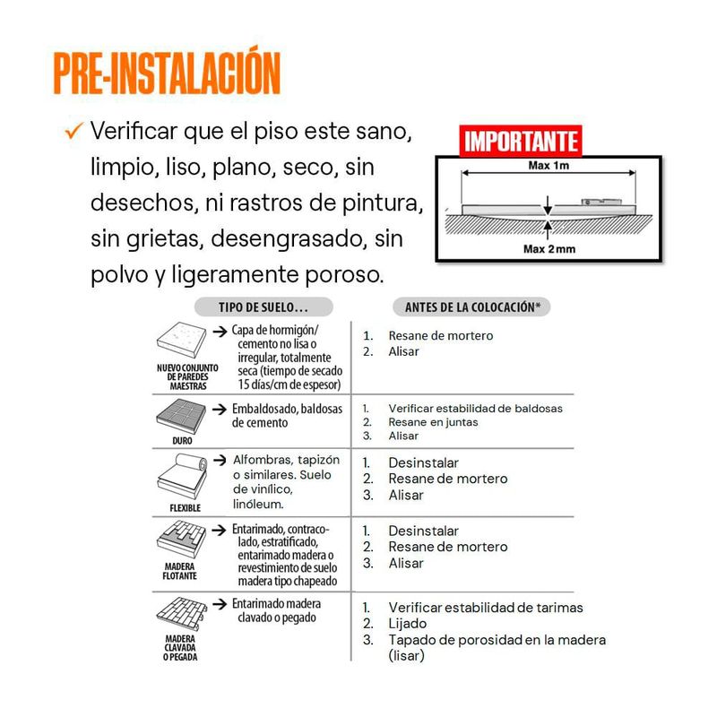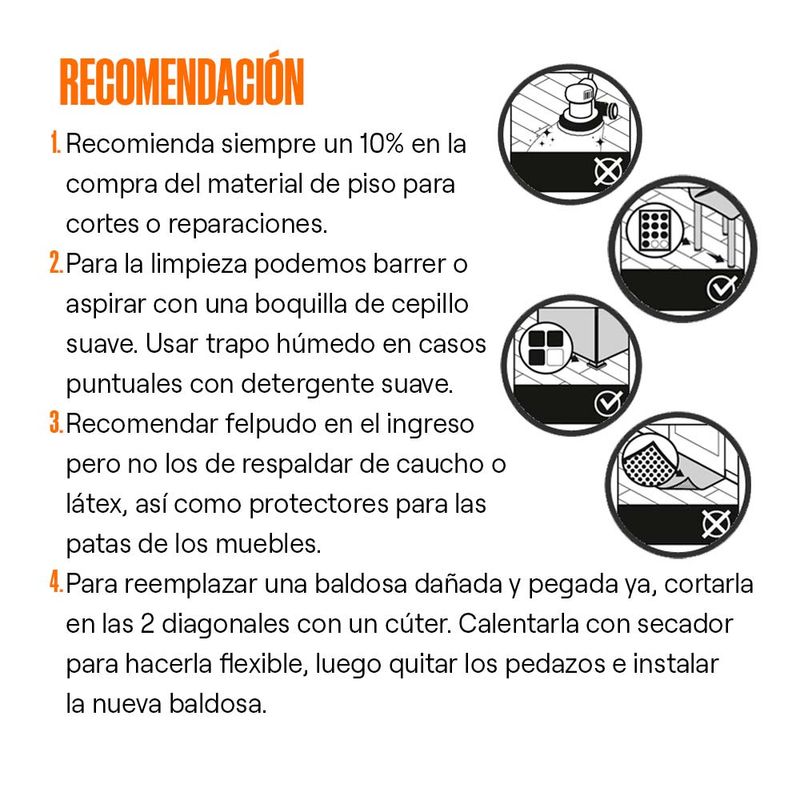 Piso de fácil instalación y mantenimiento, cuenta con una capa protectora que alarga la vida útil del producto. Ideal para casas, departamentos, oficinas o negocios de tránsito ligero.