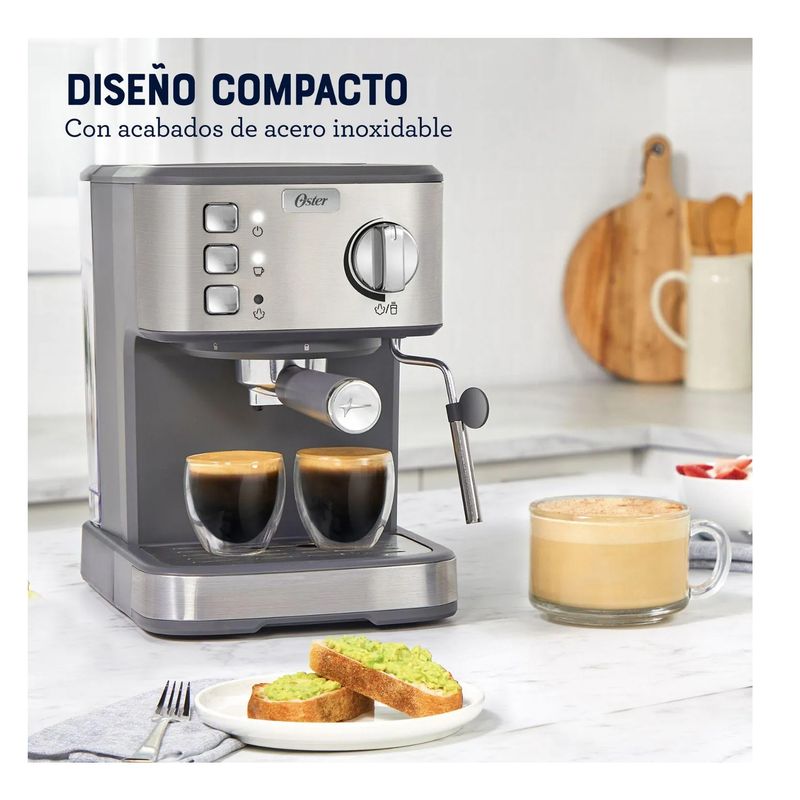 La cafetera compacta de espresso Oster® tiene un elegante diseño con acabados de acero inoxidable y su tamaño compacto la hace un complemento elegante para cualquier cocina. Es compatible con cápsulas de Dolce Gusto® y posee un tubo de vapor cuya intensidad puede ser ajustada con una perilla, lo cual te permitirá crear leche espumosa para preparar deliciosos capuchinos, lattes y más. Tiene una bomba italiana de 15 bar de presión para preparar un deliciosos espresso y puede preparar hasta dos espressos por ciclo. Posee un tanque de agua de 1.5L extraíble que permite llenarlo fácilmente y una fácil limpieza, además incluye porta filtros para café molido de 1 y 2 tazas y una cuchara medidora/aplanador de café.