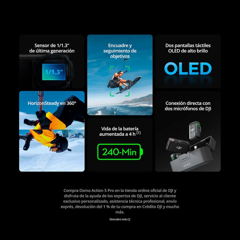 Combo inteligente y memoria optimizada: Este combo incluye almacenamiento interno de 64?GB (47?GB disponibles), ideal para grabar sin interrupciones. Su sistema de grabación cuenta con formatos JPEG/RAW y múltiples resoluciones 4K y 2.7K, permitiendo máxima creatividad en cualquier terreno. El diseño compacto de 70,5 × 44,2 × 32,8?mm y solo 146?g la hacen ultra portátil. La DJI Osmo Action 5 Pro redefine lo que una cámara de acción puede lograr. ¡Domina cada escena con total libertad!