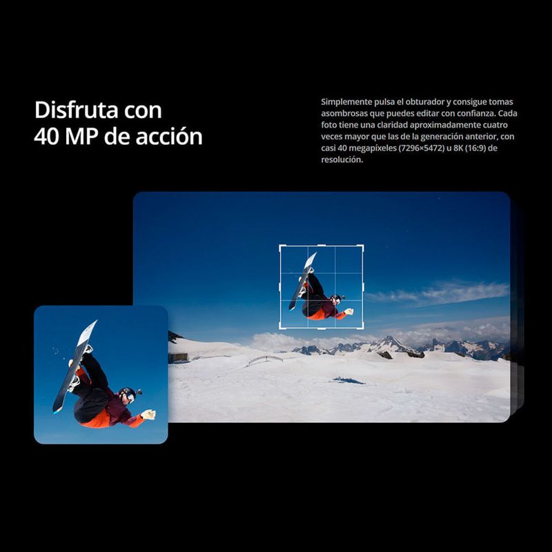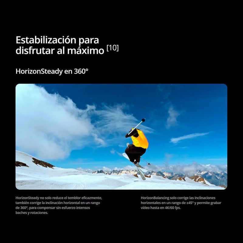 Estabilización HorizonSteady y pantallas OLED: Disfruta de grabaciones fluidas gracias a la estabilización electrónica RockSteady 3.0 y HorizonSteady 360°. Cuenta con pantallas táctiles OLED ultra brillantes (frontal de 1,46" y trasera de 2,5") con hasta 1000?nits para una visibilidad total. Incluye 3 baterías de 1950?mAh para filmar sin límites y grabación de fotos a 40 MP (7296 × 5472 px). Incorpora Wi-Fi 6, transferencia por cable y compatibilidad con tarjetas microSD hasta 1?TB.