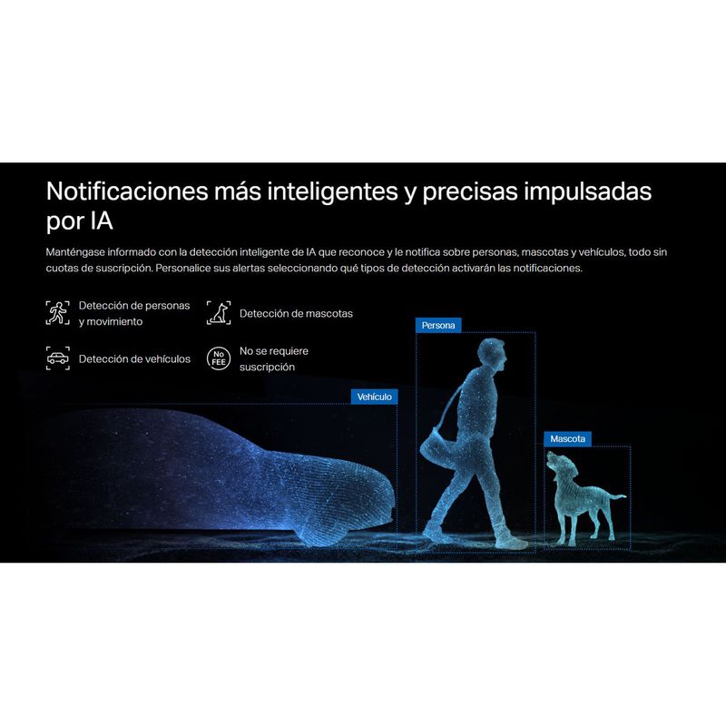 - Detección IA de movimiento, personas, mascotas y vehículos con notificaciones al celular