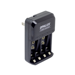 Cargador compacto Opalux OP-BC8021 compatible con pilas recargables Ni-MH o Ni-Cd. Permite recargar hasta 4 pilas AA o AAA, o 2 pilas de 9 V. Cuenta con enchufe plegable, indicador LED y sistema de apagado automático tras aprox. 9.5 horas