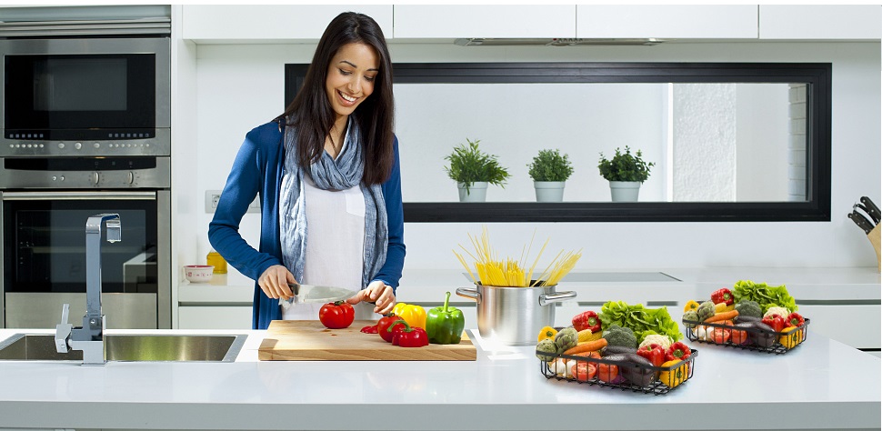 La canasta de malla de alambre mantiene las frutas y verduras frescas con circulación de aire.