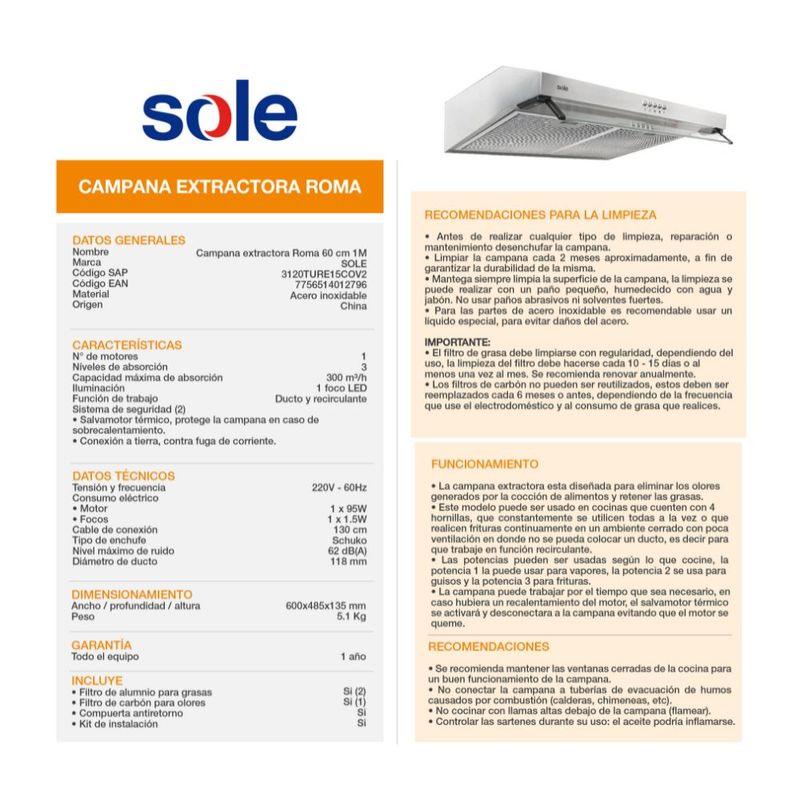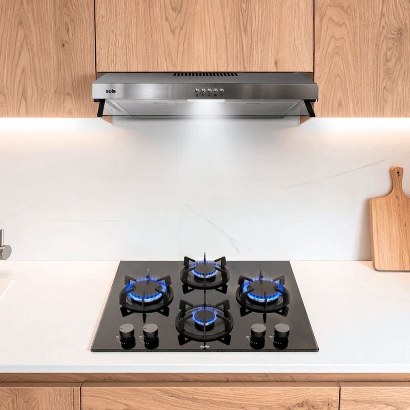 ElectrohogarCocinaHornos EmpotrablesCOMBO Sole: Cocina Encimera 60cm Rubí 4 Hornillas Vidrio Templado + Campana Extractora Convencional 60cm Nueva Roma 1 Motor Acero Inoxidable