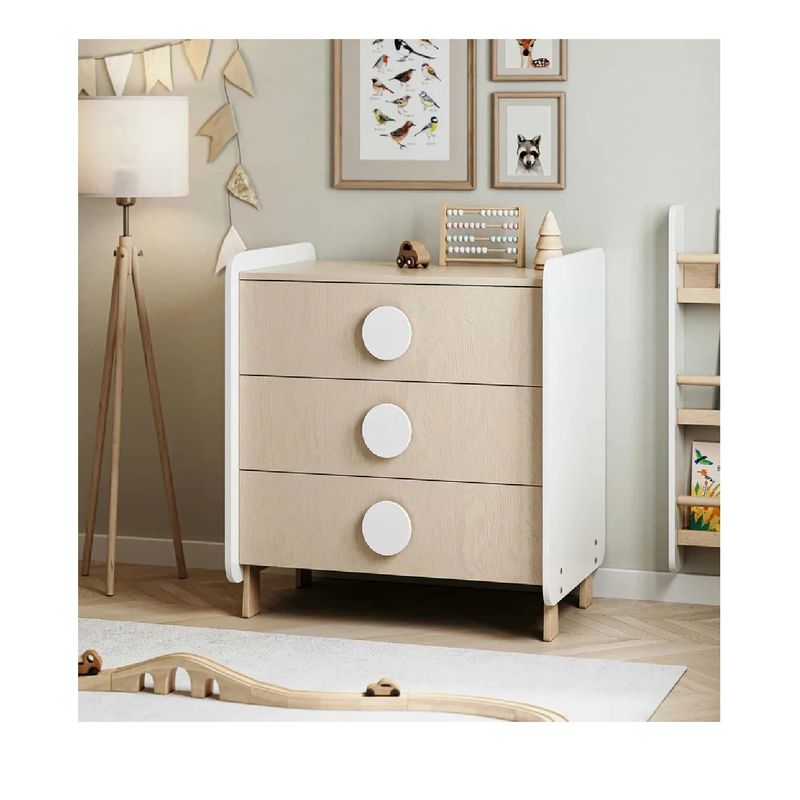 Organiza el espacio de tus hijos con nuestras cómodas infantiles, pensadas para padres que valoran la funcionalidad, la estética y la seguridad en el dormitorio infantil. Su diseño moderno y acabado en Melamina con detalles en Blanco/Sonoma aporta calidez y armonía, mientras que sus tres amplios cajones permiten guardar ropa, juguetes y accesorios de forma práctica y accesible.