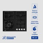 Quemadores: 4 (1 pequeño, 2 medianos y 1 triple flama) • Quemador Europeo SABAF (Italia): Si, triple flama • Parrillas: Hierro fundido • Mesa de cocción: Vidrio Templado • Tipo de encendido: eléctrico automático