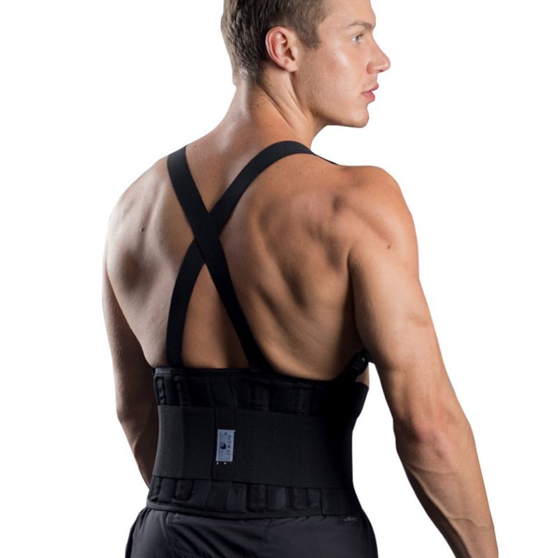 Faja lumbar confeccionada en poliéster y spandex que brinda soporte a la zona baja de la espalda y abdomen cuando se levanta cargas pesadas.