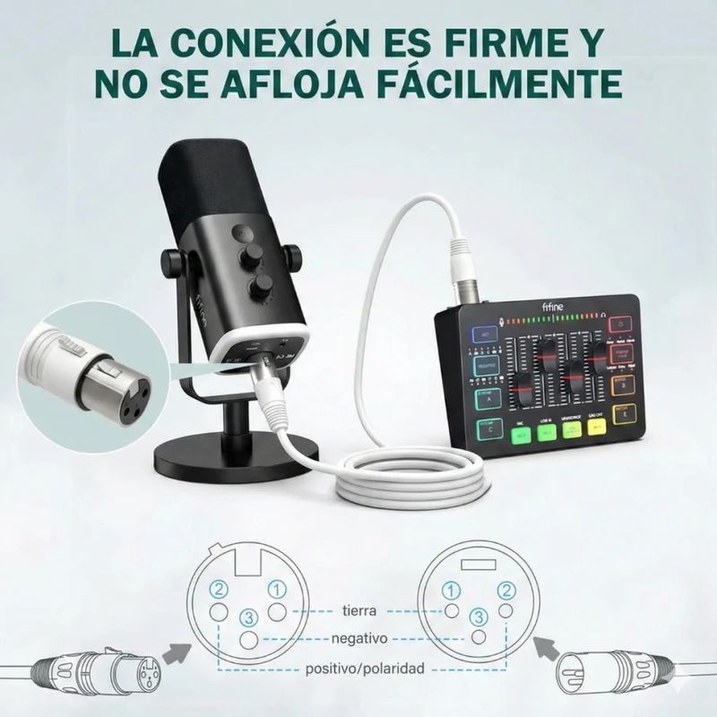 El cable Fifine L9C es un cable de audio balanceado XLR de 3 pines (macho a hembra) de 1.8 metros, diseñado para micrófonos profesionales y setups de escritorio o streaming, que destaca por su conductor de cobre de alta pureza y blindaje interno que reducen interferencias y ruido, garantizando una transmisión clara y estable; además, cuenta con conectores seguros con sistema de bloqueo y se comercializa en colores como blanco y rosado, siendo una opción confiable y estética para quienes buscan calidad de señal y durabilidad en sus equipos de audio.