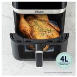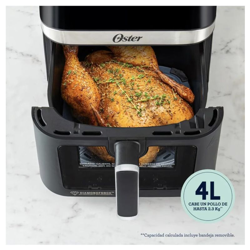 Transforma tu experiencia culinaria con nuestra freidora de aire digital Oster® de última generación. Con nuestro recubrimiento Oster® DiamondForce, que es hasta 12 veces más resistente a rayaduras y hasta 15 veces más fácil de limpiar* que los recubrimientos convencionales, tu freidora se mantendrá en perfectas condiciones durante más tiempo. Su capacidad de 4L** permite cocinar un pollo de hasta 2.3Kg. Equipada con una ventana transparente y una luz interna, esta freidora te brinda una visión clara del proceso de cocción en cada paso del proceso. Con 10 Programas automáticos: Papas fritas, alitas, aves, carne, vegetales, pescado/mariscos, hornear, postre, deshidratar y calentar. Esta freidora simplifica la preparación de una variedad de platos con solo tocar un botón. Además, nuestro innovador sistema de recordatorio automático te alerta para voltear la comida en medio del ciclo de cocción, garantizando resultados perfectamente dorados y crujientes en cada bocado. Ya sea que estés cocinando alitas, asando verduras o deshidratando frutas, esta freidora digital te ofrece versatilidad y conveniencia en cada uso.