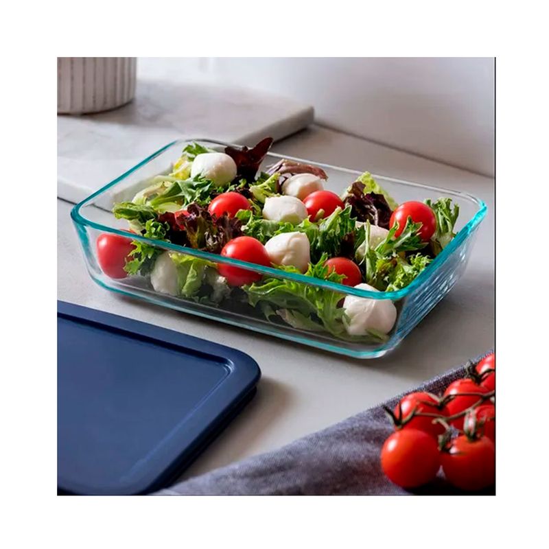 La tapa azul sella frescura para refrigeradora y evita derrames en la lonchera o el tupper del trabajo. Vidrio resistente de Pyrex que no absorbe olores ni sabores, fácil de limpiar y lista para acompañarte por años. Ideal para microondas y horno sin tapa, y para congelar porciones sin ocupar espacio.
