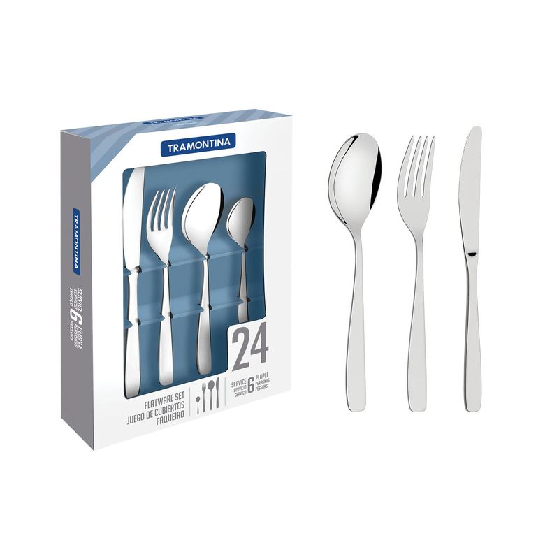 Siempre tenga a la mano el juego de cubiertos Cosmos de acero inoxidable con cuchillos para asado y terminación brillante de 24 piezas Tramontina. Esencial para servir los platos del día a día, Este conjunto trae 24 piezas hechas totalmente de acero inoxidable. Altamente durables, poseen una terminación brillante, agregando un toque de encanto a su mesa. Las cucharas cuentan con cuenca en formato simétrico y bordes cuidadosamente redondeados. Los tenedores tienen dientes pulidos en la parte interna con formato apropiado para la boca y bordes redondeados para proporcionar más comodidad en el uso. Los cuchillos totalmente templados, que le garantiza mayor durabilidad al filo de corte y mayor resistencia a la corrosión. Por sus características de templabilidad, los cuchillos no arañan la porcelana. Este juego es muy práctico y lo ayudará al momento de limpiar, ya que se puede lavar diariamente en el lavavajillas. ¡Un juego indispensable para servir bien!