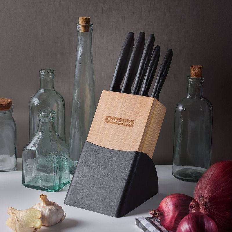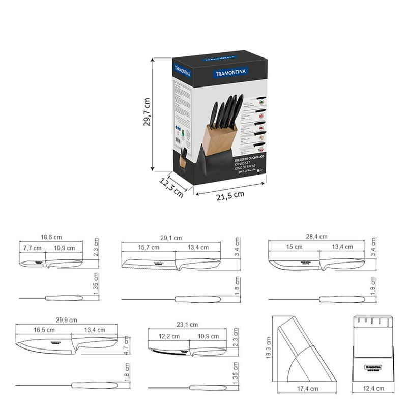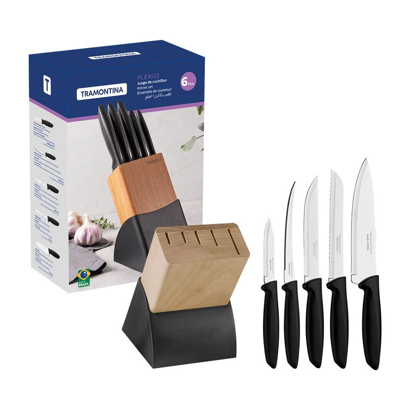 Complete su cocina con el juego de cuchillos Tramontina Plenus de 06 piezas y garantice más practicidad para sus comidas. Desarrollados para acompañarlo en la preparación de las recetas más variadas, los cuchillos del juego poseen láminas de acero inoxidable con mayor durabilidad en el filo y mangos de polipropileno, que garantizan mayor resistencia y durabilidad.