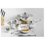 Material: acero inoxidable.Tapa de vidrio templado con borde y pomo de acero inoxidable. Producto con fondo triple (acero inoxidable + aluminio + acero inoxidable).